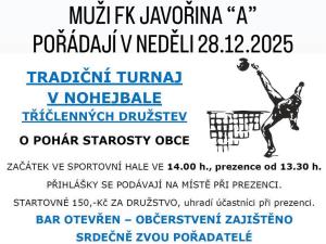 Přijďte si zasportovat a pobavit se během svátečního období! V neděli 28.12.2025 ve sportovní hale. Začátek ve 14.00 hod, registrace od 13:30 hod. Občerstvení zajištěno.