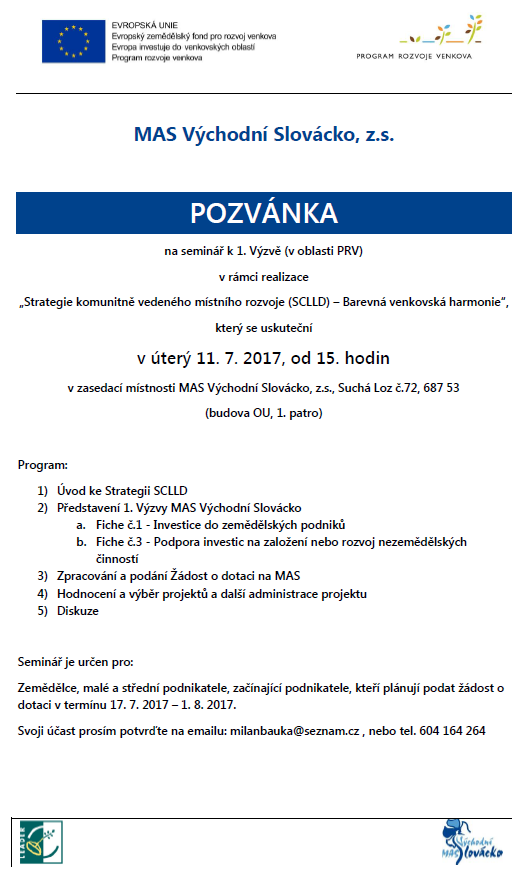 Seminář pro žadatele se koná dne 11. 7. 2017 od 15 hodin v OU Suchá Loz.