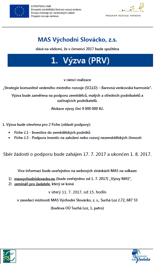 MAS Východní Slovácko, z.s. dává na vědomí, že v červenci 2017 bude spuštěna 1. výzva (PRV) v rámci realizace "Strategie komunitně vedeného rozvoje (SCLLD) - Barevná venkovská harmonie".
