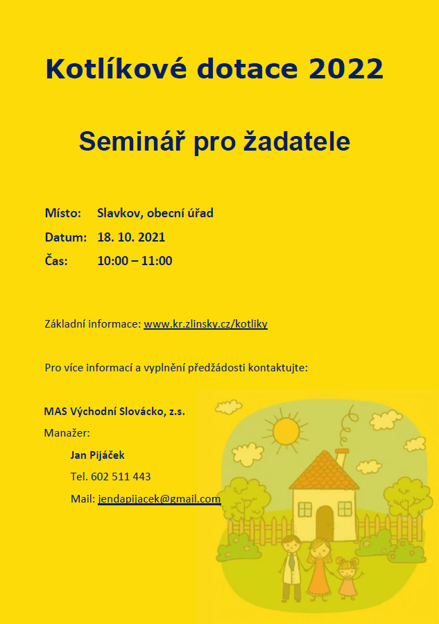 Obecní úřad Slavkov oznamuje že dne 18.10.2021 to je v pondělí od 10–11 hodin proběhne na obecním úřadě seminář pro zájemce o Kotlíkové dotace. Kdo má zájem vyměnit svůj starý kotel na tuhá paliva přijďte se seznámit s informacemi o možností získání dotace.