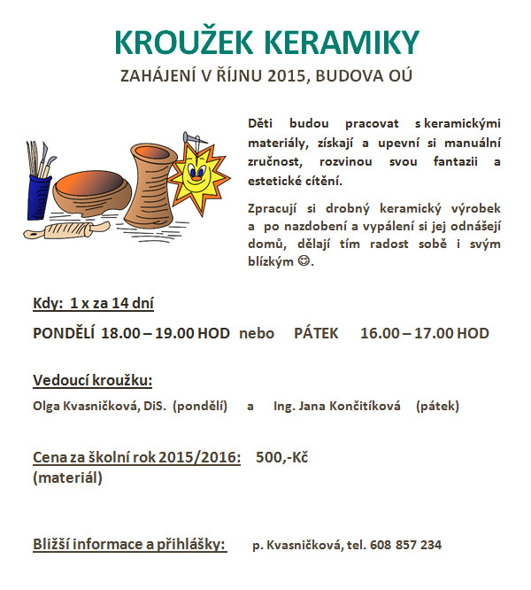 V rámci rozvoje volnočasových aktivit dětí a mládeže v naší obci začne od října kroužek keramiky. Dále připravujeme kroužek železničního modelářství - podrobnosti budou upřesněny...