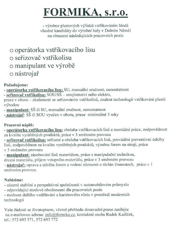 Nabídka zaměstnání - Formika, s.r.o., Dolní Němčí