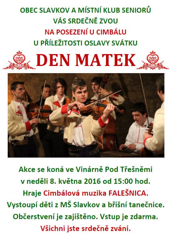 Obec Slavkov a místní Klub seniorů vás srdečně zvou na "DEN MATEK" ve Slavkově