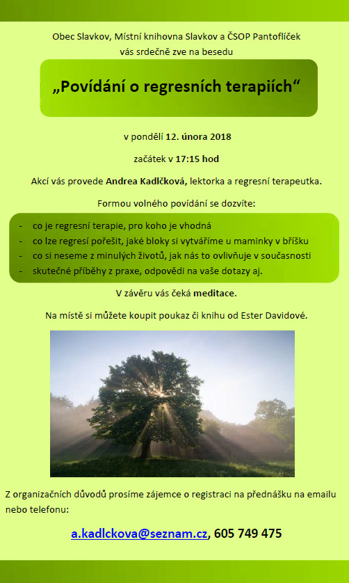 Pozvánka - další beseda z cyklu kulturních večerů ve Slavkově se bude týkat REGRESNÍ TERAPIE. Přijďte zjistit o co se jedná, pro koho je vhodná a co lze regresí pořešit. Z organizačních důvodů prosíme zájemce o registraci na přednášku - viz přiložený plakátek. Beseda se koná v pondělí 12. února v zasedací místnosti OÚ Slavkov. Začátek je v 17:15. Nenechte si ujít :-)