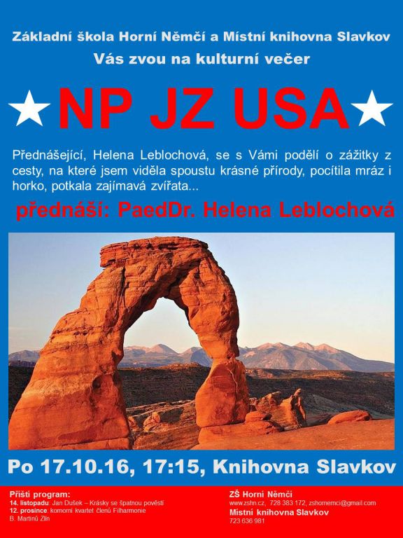 POZOR - od října pro vás opět Obecní úřad Slavkov, Základní škola Horní Němčí a hlavně Místní knihovna Slavkov společně připravují tradiční cestopisné besedy s projekcí. První beseda se uskuteční již v pondělí 17.10.2016 v místní knihovně - přednášející PaedDr. Helena Leblochová. Srdečně vás všechny zveme na příjemně vzdělávací pohodový podvečer...