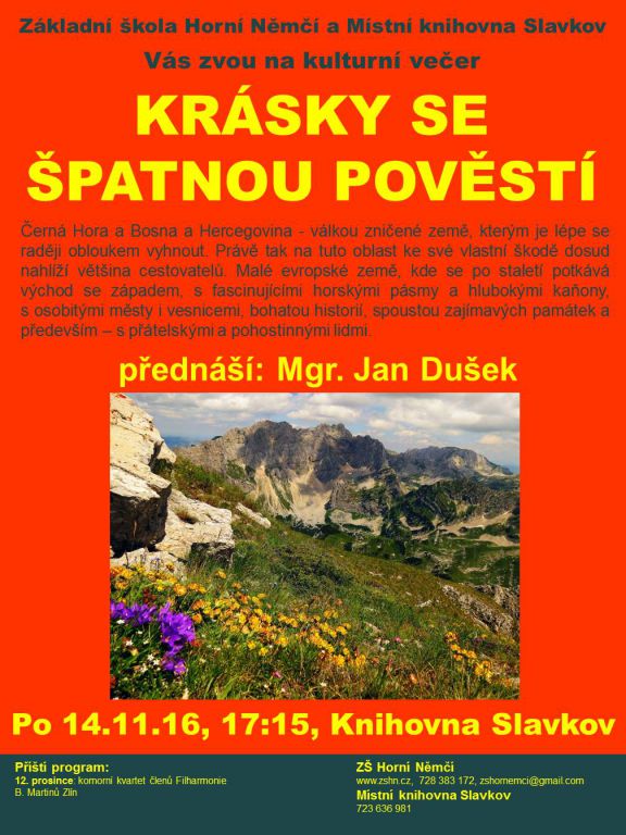 POZVÁNKA - na cestopisnou besedu s projekcí v místní knihovně na téma "KRÁSKY SE ŠPATNOU POVĚSTÍ (Černá Hora a Bosna a Hercegovina)"