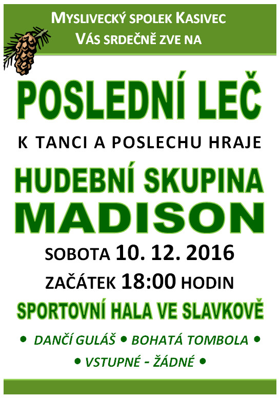 Myslivecký spolek Kasivec Slavkov Vás srdečně zve na POSLEDNÍ LEČ - sobota 10.12.2016 - sportovní hala Slavkov. Neváhejte a přijďte ochutnat výtečný gulášek, omrknout krásnou výzdobu sálu a hlavně se skvěle pobavit ...