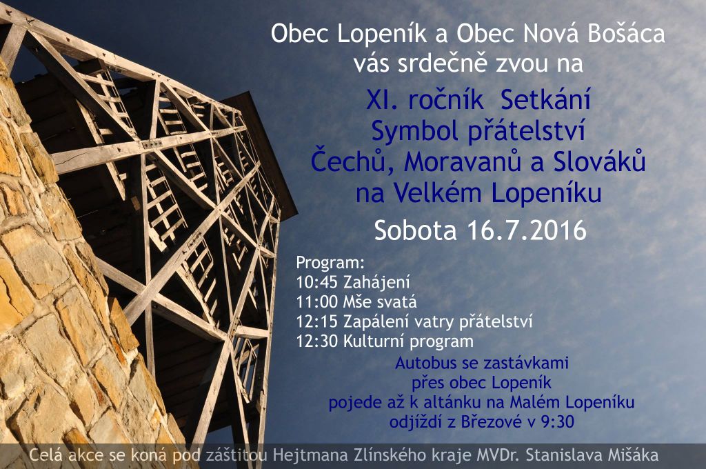 přijměte pozvání na XI. ročník Setkání - Symbol přátelství Čechů, Moravanů a Slováků na Velkém Lopeníku, které se koná v sobotu 16.7.2016.