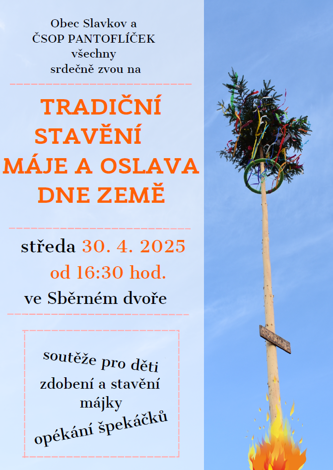 Stavění máje ve středu 30.04.2025 ve sběrném dvoru. Sraz v 16:30 hod. Bude připraveno zábavné odpoledne, opékání špekáčků, stavění máje apod. Těšit se můžete na čepované pivko a další pochutiny.