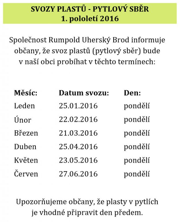 Termíny svozu plastů (pytlový sběr) v obci Slavkov