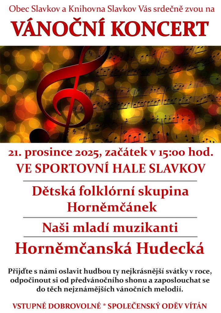 Obec Slavkov a Knihovna Slavkov Vás srdečně zvou na Vánoční koncert, který se bude konat 21. prosince, ve sportovní hale Slavkov. Začátek je v 15:00. hod.
