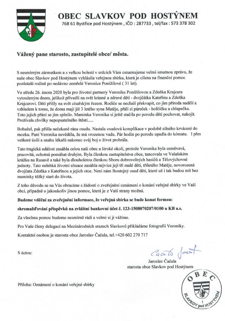 Tato tragická událost zasáhla nejvíce její tři malé děti, tříletého Matěje, novorozená dvojčata Zdeňka s Kateřinou a jejich otce. Na žádost pana starosty Jaroslava Čačaly tedy zveřejňujeme informaci o konání veřejné sbírky, která je cílena na finanční pomoc pozůstalé rodině. Pokud můžete nějakou částkou pomoci, budeme vděční.