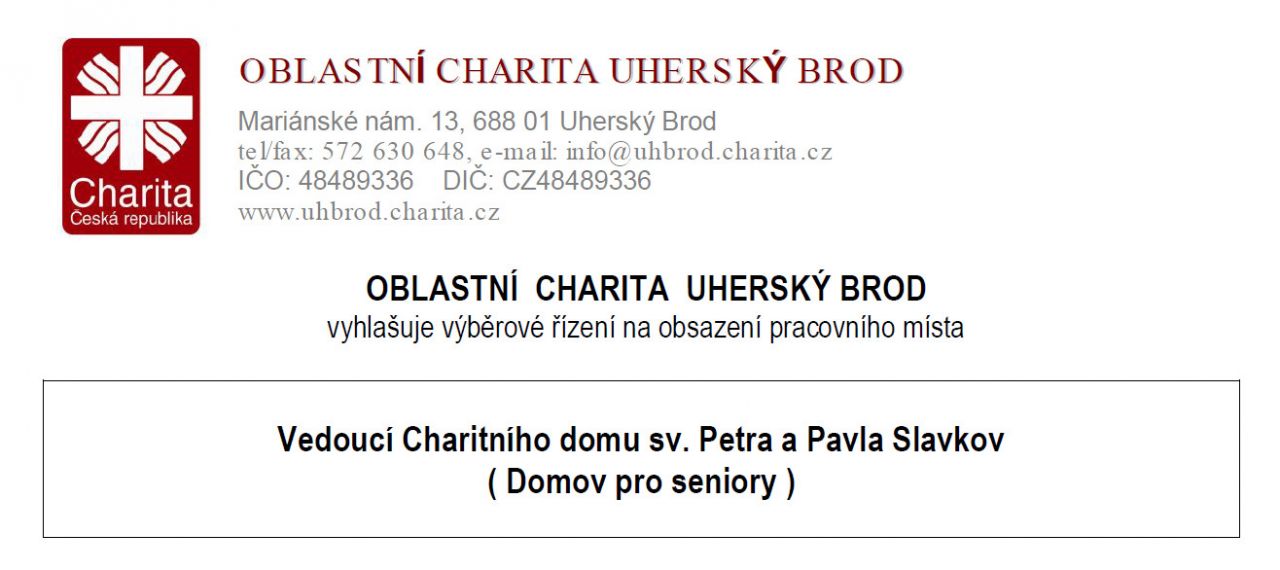 vyhlašuje výběrové řízení na obsazení pracovního místa vedoucí Charitního domu sv. Petra a Pavla Slavkov (Domov pro seniory)