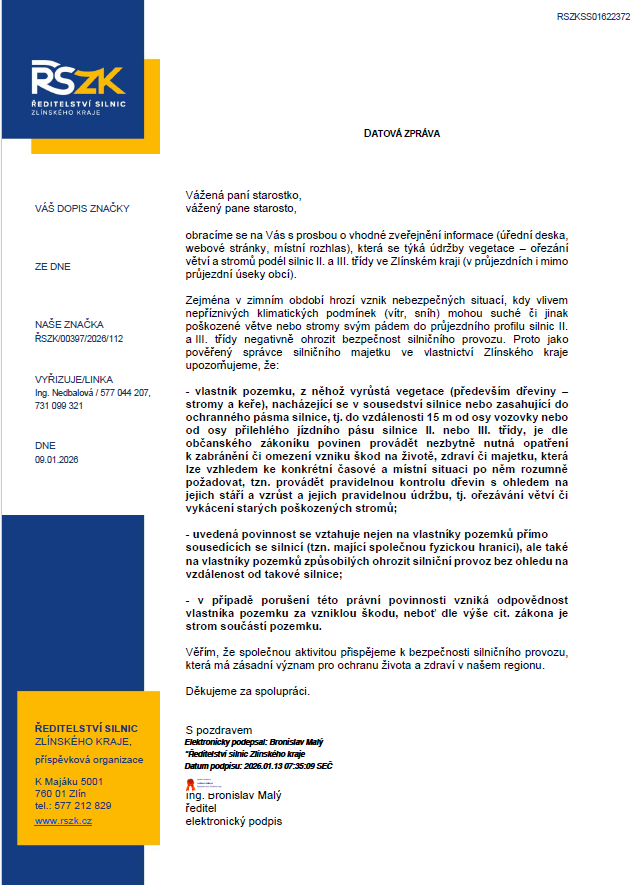 Zejména v zimním období hrozí vznik nebezpečných situací, kdy vlivem nepříznivých klimatických podmínek (vítr, sníh) mohou suché či jinak poškozené větve nebo stromy svým pádem do průjezdního profilu silnic II. a III. třídy negativně ohrozit bezpečnost silničního provozu.