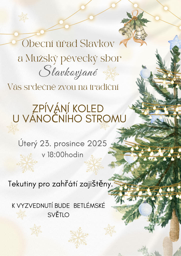 Srdečně vás zveme na tradiční zpívání koled u vánočního stromu s mužským sborem SLAVKOVJANÉ v úterý 23. prosince v 18:00 hodin.